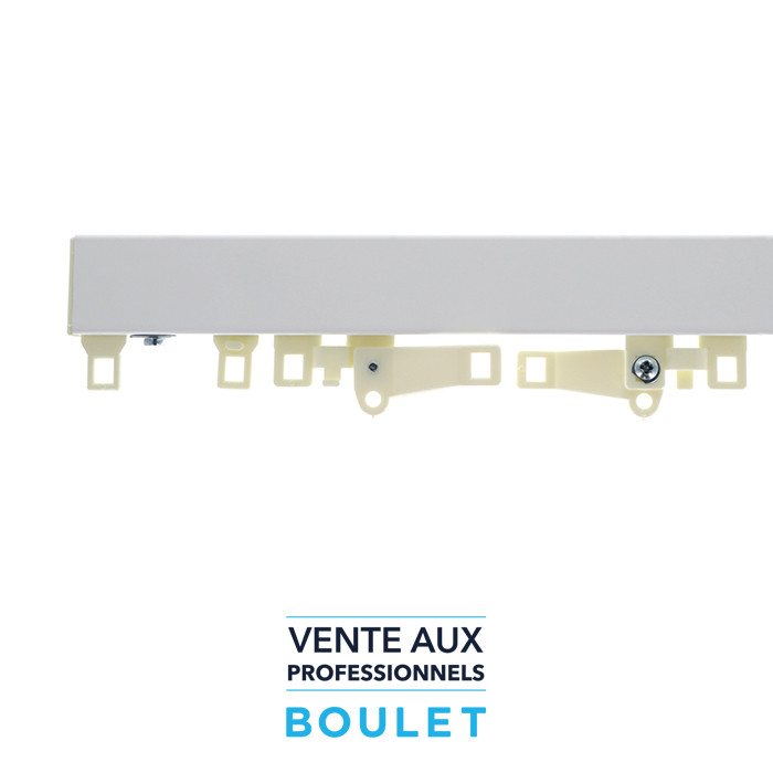 Composition de la tringle : 1 rail sur mesure de 1M00 à 5M95 en 1 partie + 10 suspendeurs au mètre + 2 fixes embouts + 2 conducteurs croisants.
