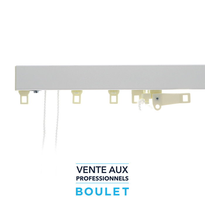 Composition de la tringle : 1 rail 700 sur-mesure en 1 partie + 10 suspendeurs au mètre + 2 fixes embouts + 1 conducteur croisant + 1 cordon de tirage ø3,5 mm haut de 3M00 + 1 poulie de tirage et 1 poulie de renvoi.