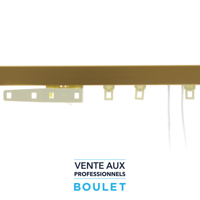 Compositions de la tringle : 1 rail 100 avec tirage sur-mesure en 1 partie + 10 suspendeurs au mètre + 1 conducteur avec patte de croisement amovible + 1 cordon de tirage sans fin - hauteur 2M50 + 1 poulie de renvoie et 1 poulie de tirage.